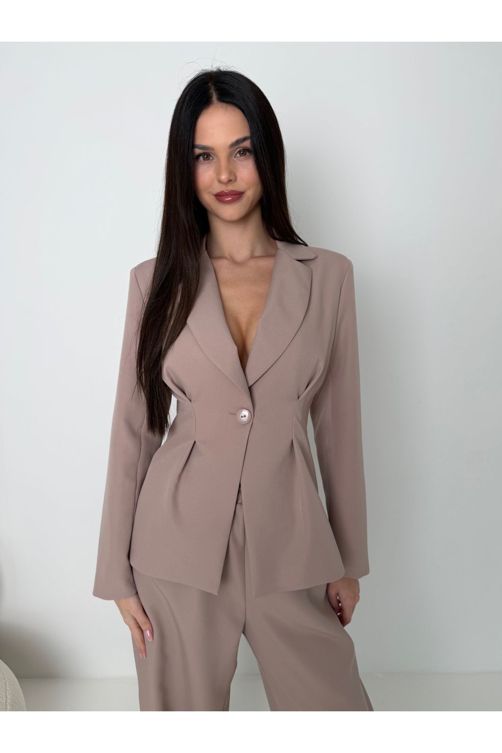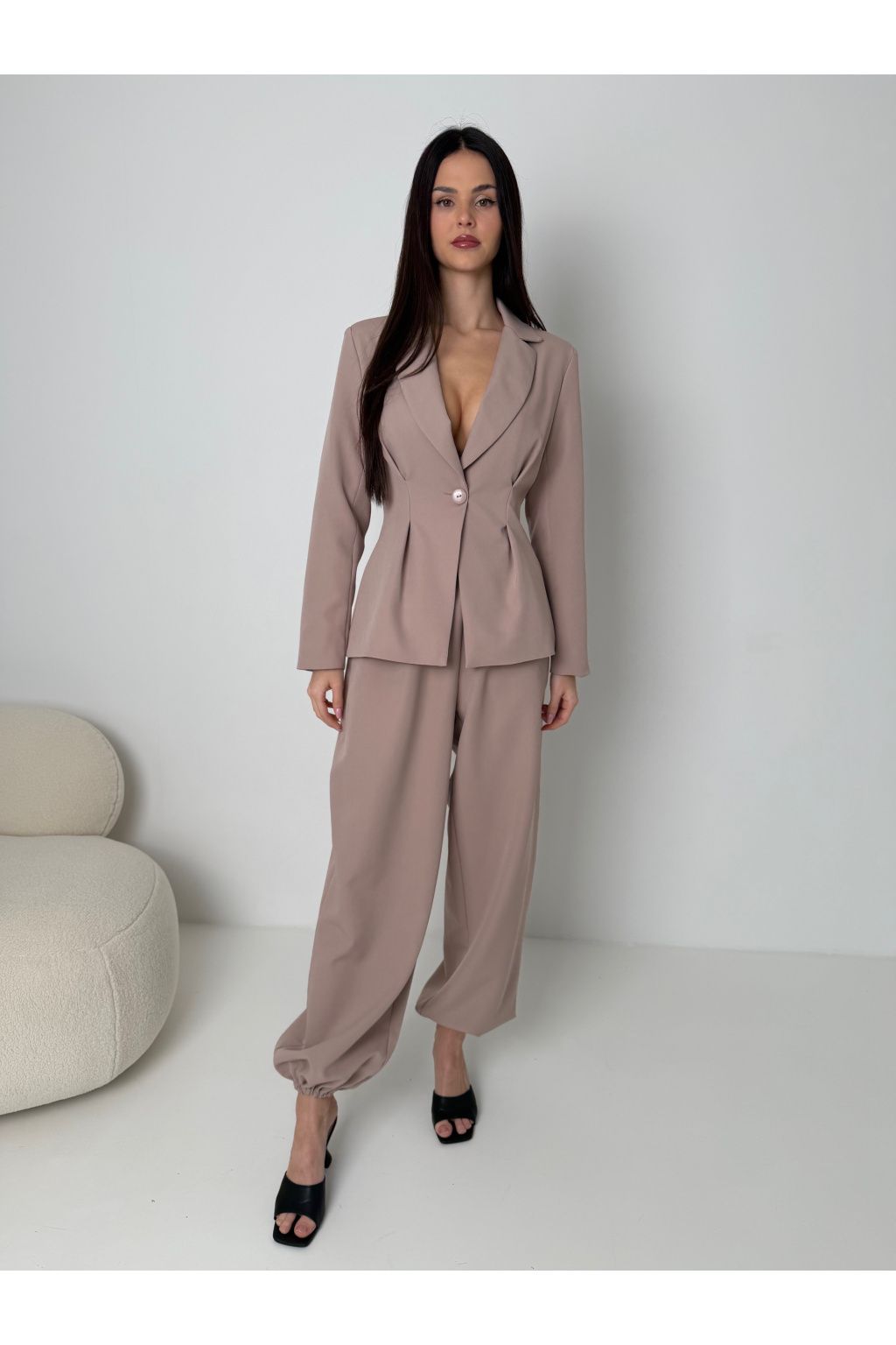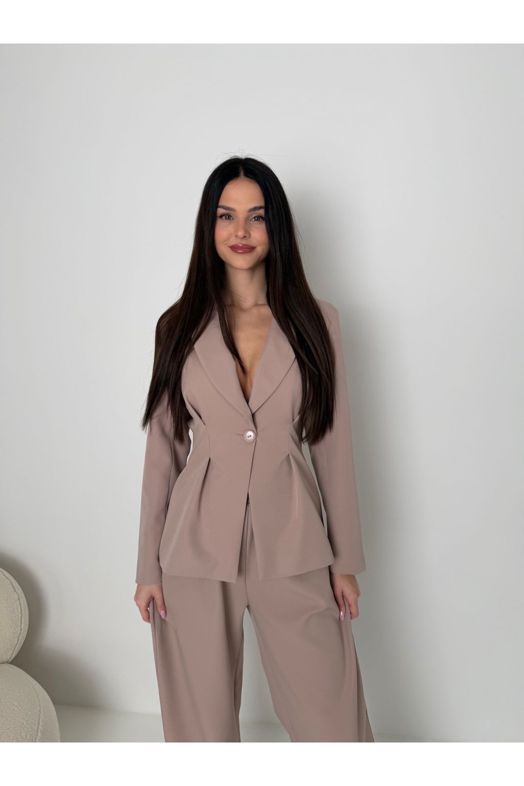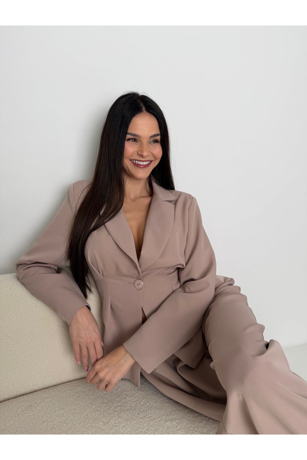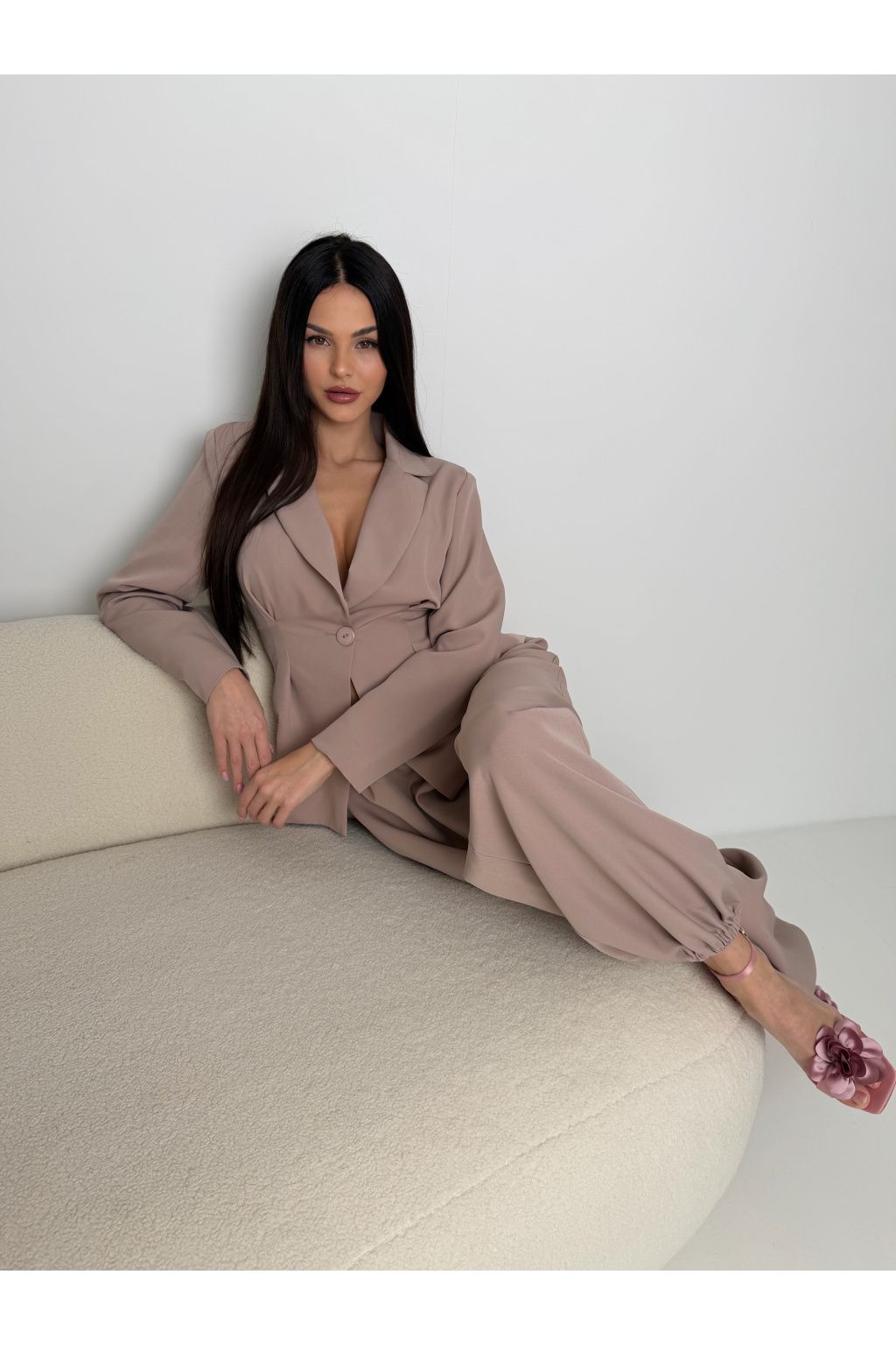 Elegantní vypasované sako má jeden knoflík. Součástí jsou volné pohodlné kalhoty dle nejnovějších módních trendů.