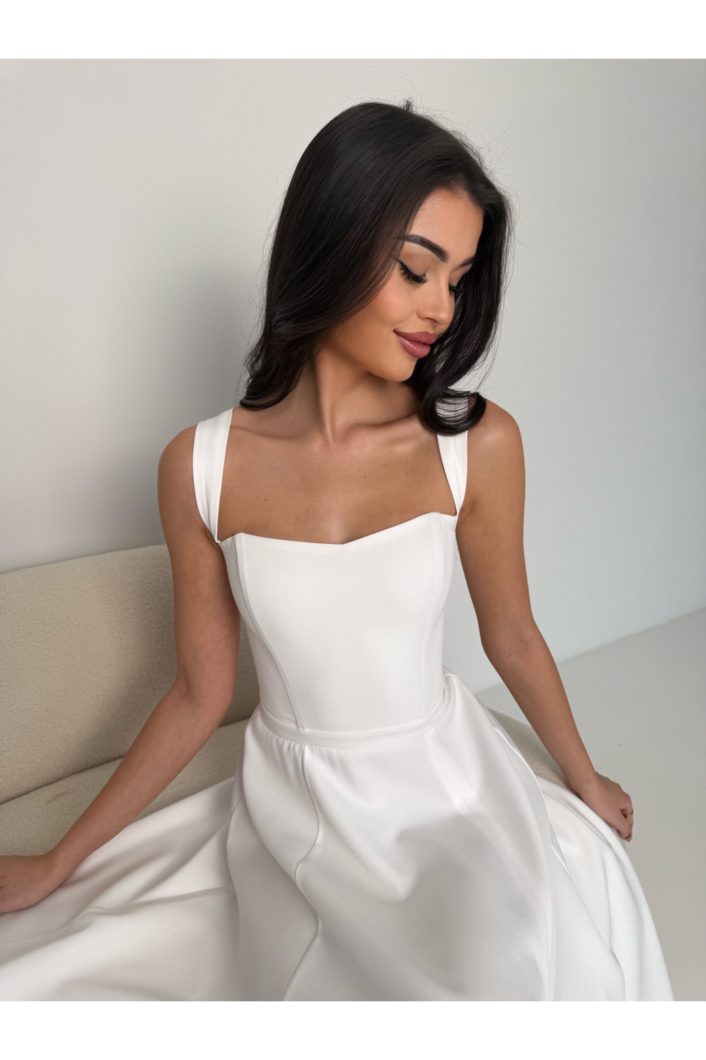 - Korzetový výstřih: Krásně tvaruje dekolt a poskytuje oporu díky integrovaným kosticím.