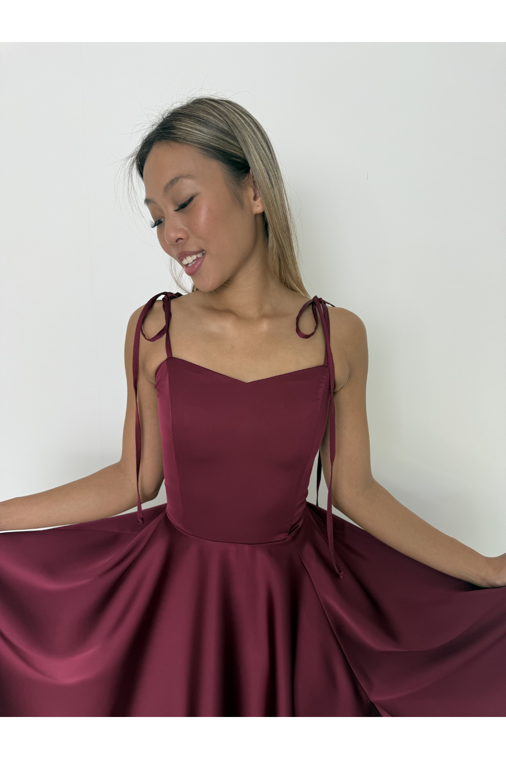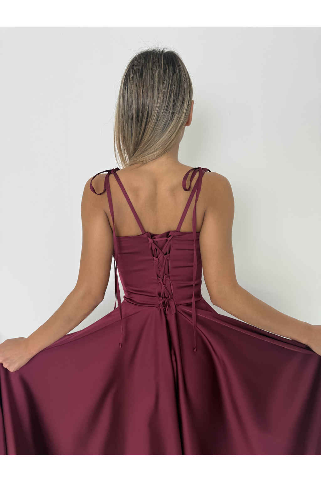 Saténové korzetové šaty ZAIRA MIDI s ramínky vínové