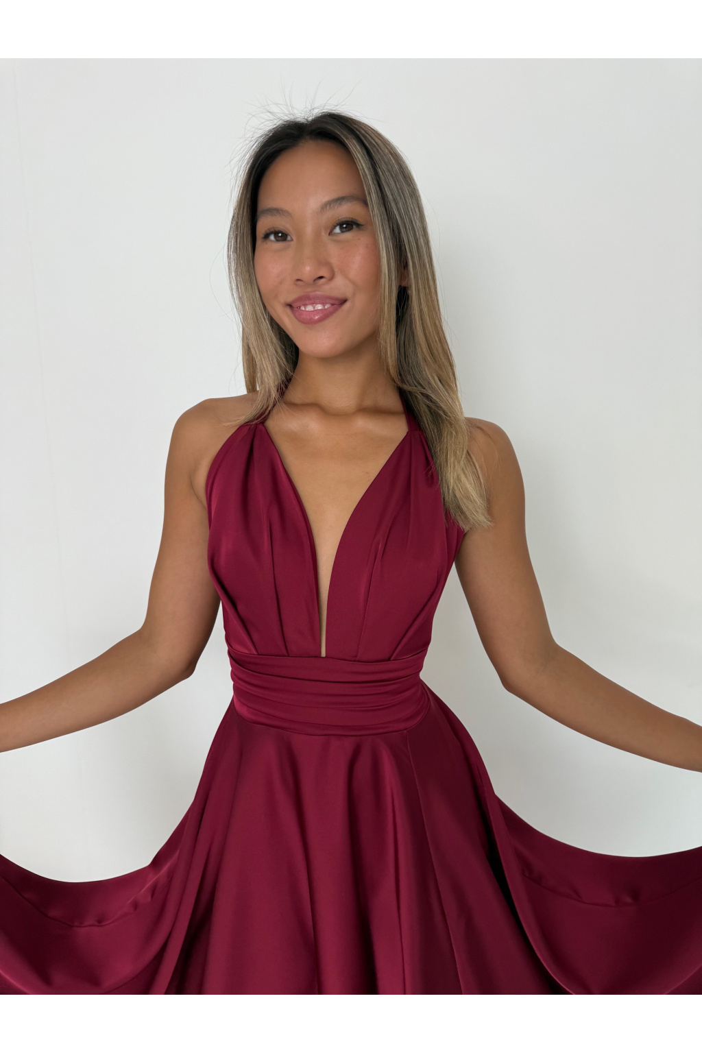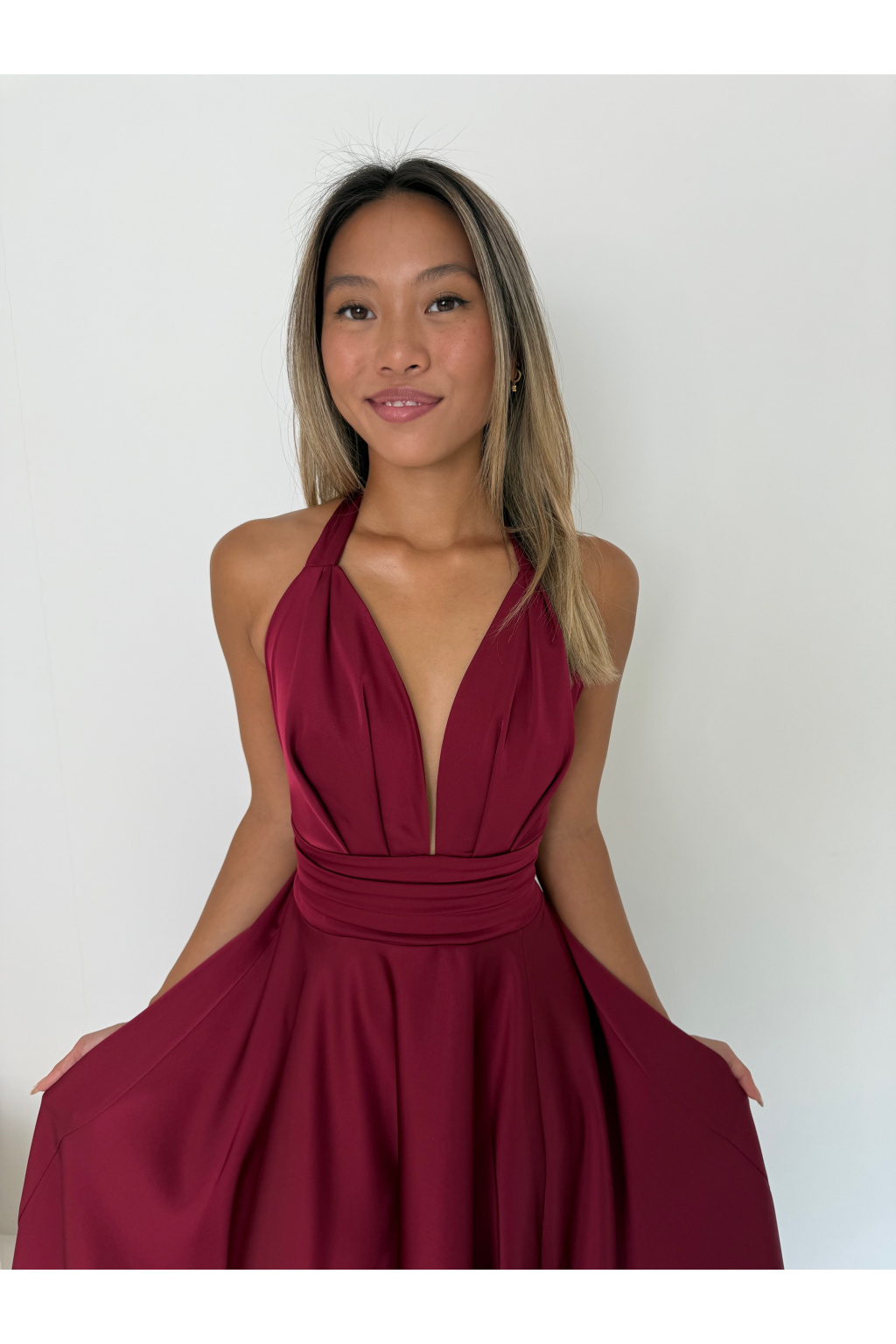 - • Šaty jsou vzadu na vázání. Jak kolem krku - tak v oblasti pasu, abyste si je velikostně přizpůsobily