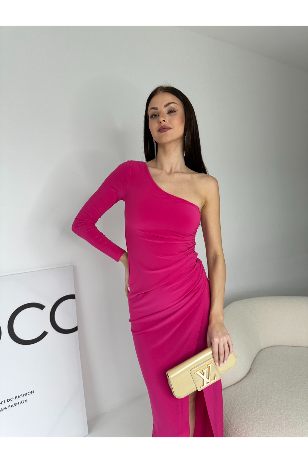 - Dominantou těchto šatů je, že mají odhalené levé rameno a jeden dlouhý rukáv na pravé straně