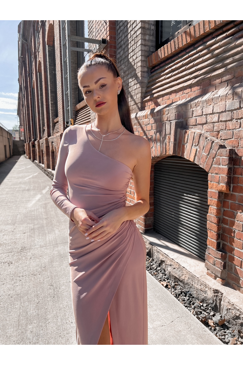 - Dominantou těchto šatů je, že mají odhalené levé rameno a jeden dlouhý rukáv na pravé straně