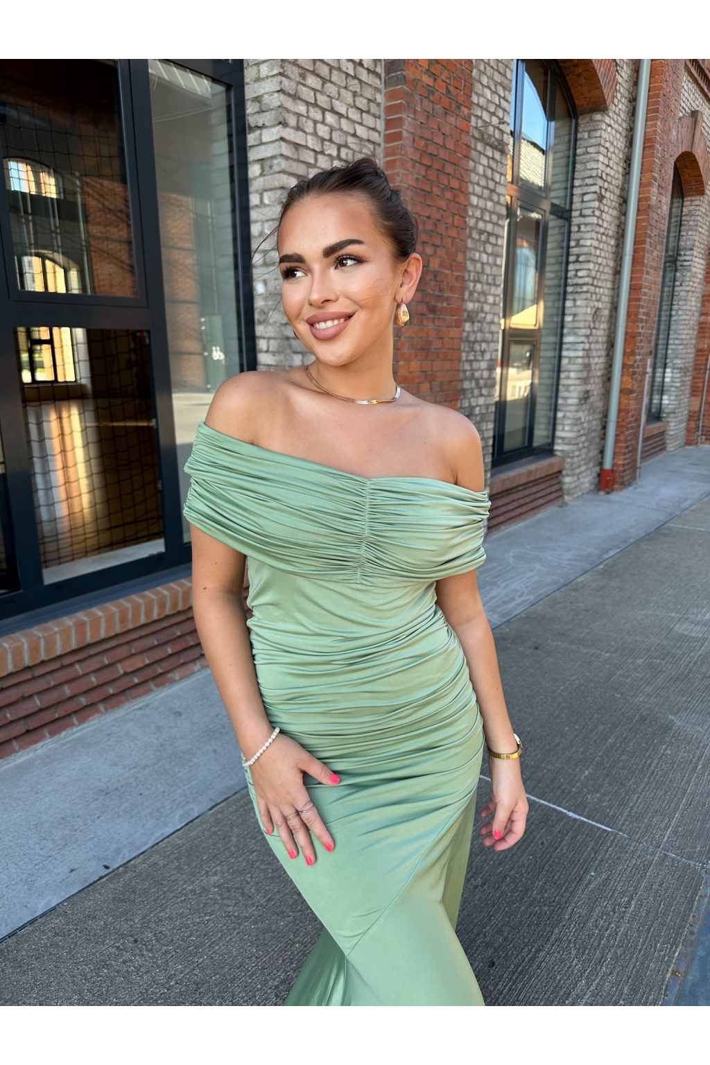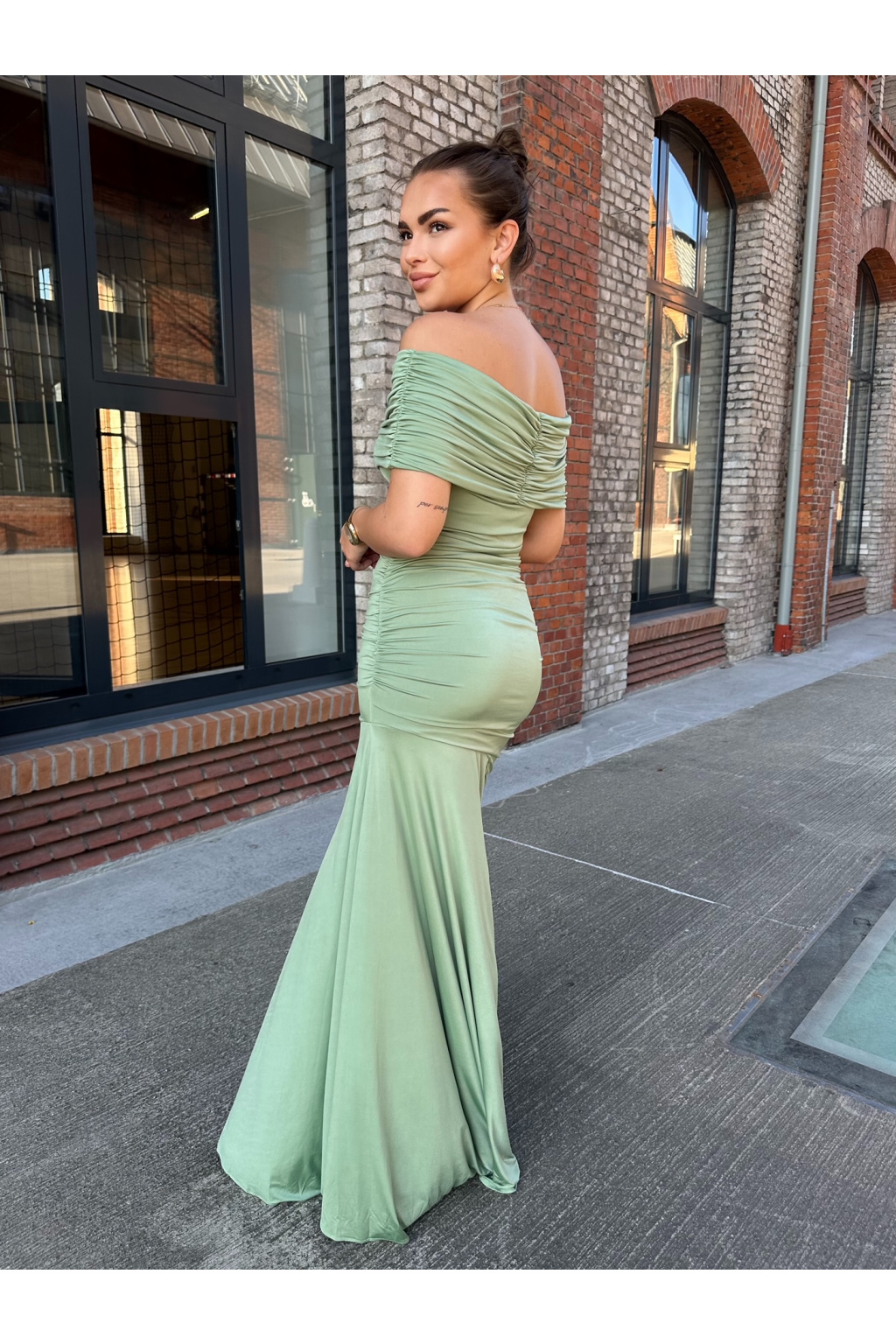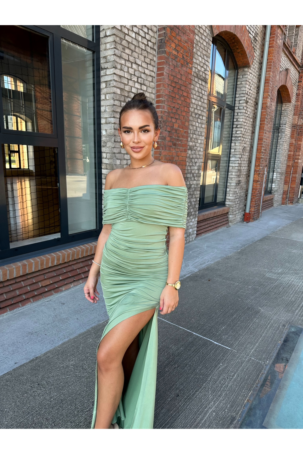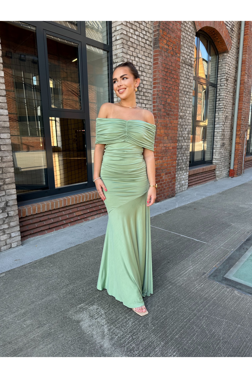 Dlouhé šaty s jedinečným řasením přes prsa a rukávky.