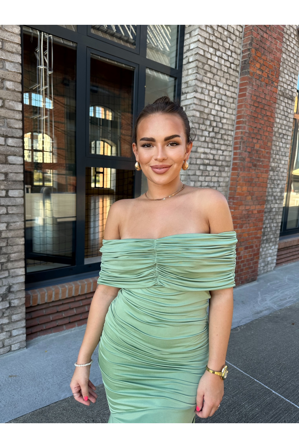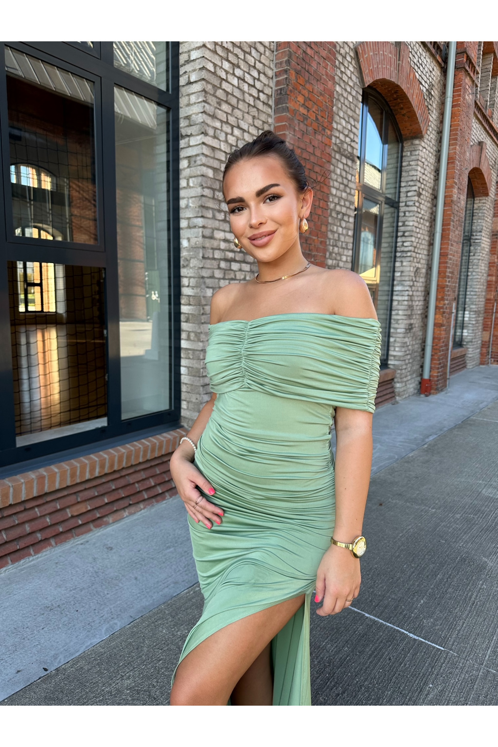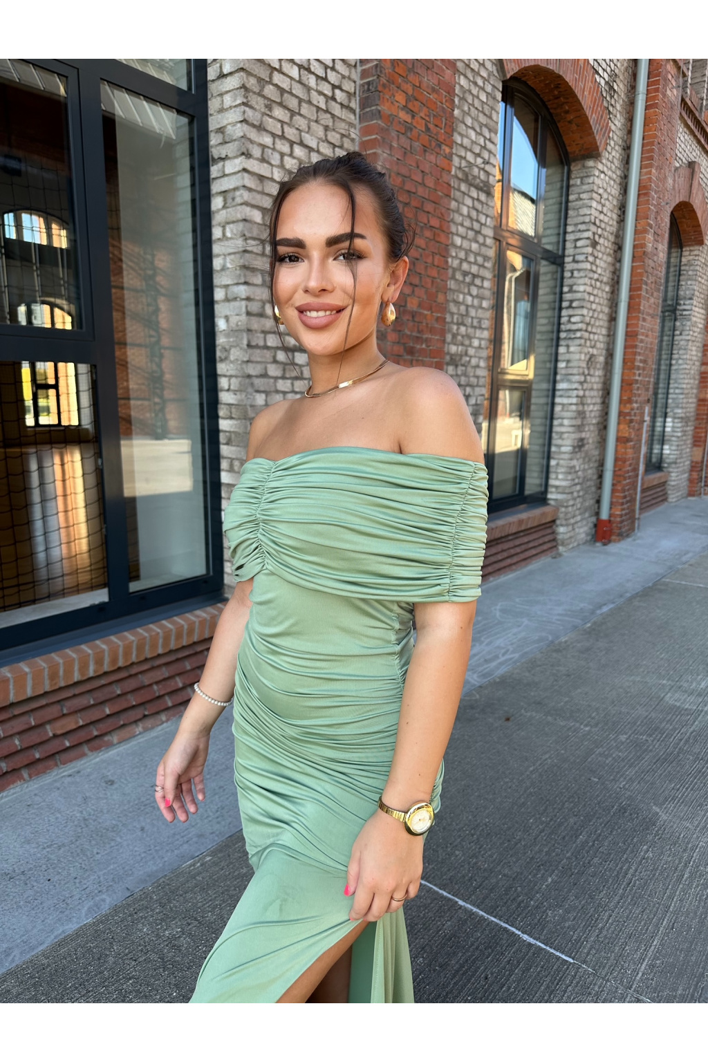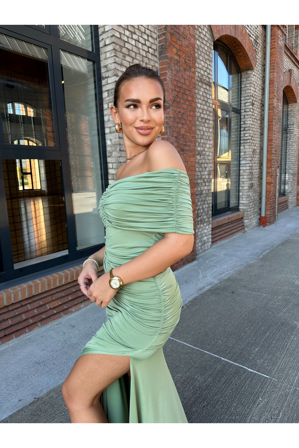 Dlouhé šaty s jedinečným řasením přes prsa a rukávky.