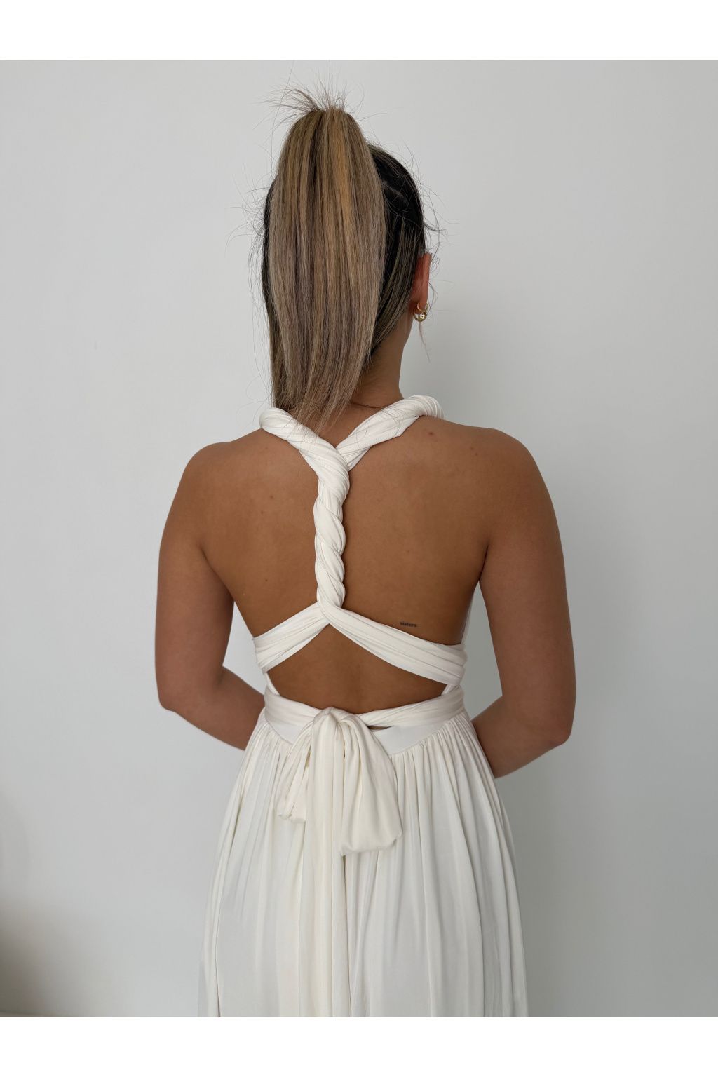 - Vázání šatů je jednoduché a nabízí mnoho variant. Inspirovat se můžete videem, které máme uložené ve výběru „Tips Vivien“ na našem instagramovém profilu. Pro zajímavější look můžete pásy kolem těla obmotat 2x (jednou pod prsy a potom pokračujete kolem pasu).